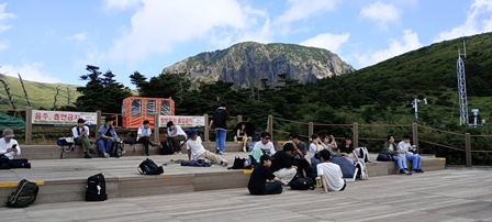 ハルラ山での実習は、高度1000mから1700mまで登山しながら、100mおきに気象観測をするというハードな内容でしたが、参加者全員がゴールであるウィッセオルムに到着することができました(写真)。気象の教科書では「気温は高度100m毎に0.65℃ずつ減じる」と書かれていますが、実際には雲や日射の影響があり、気温が高度とともに単純に減じているわけではないことを確かめることができました。